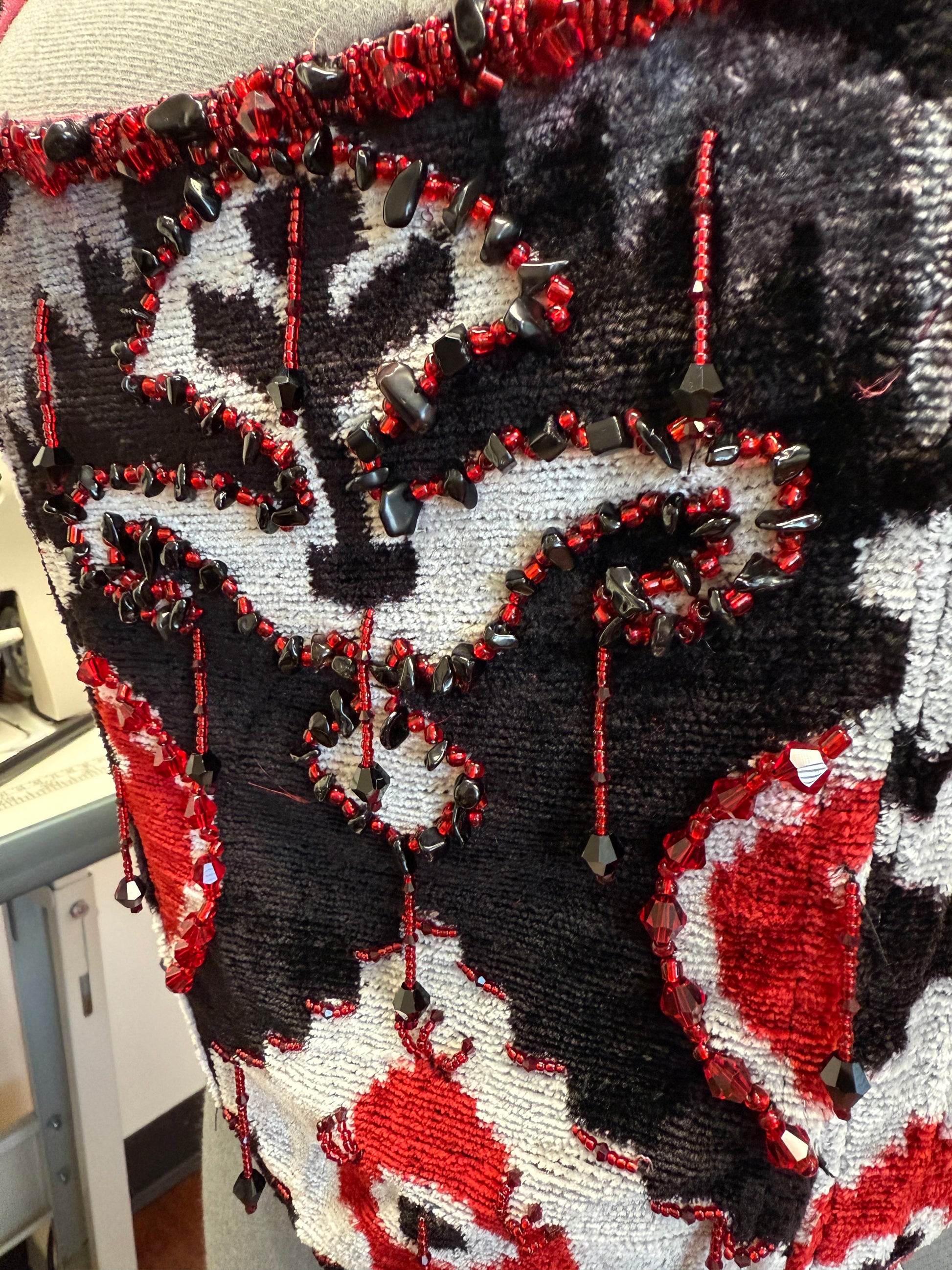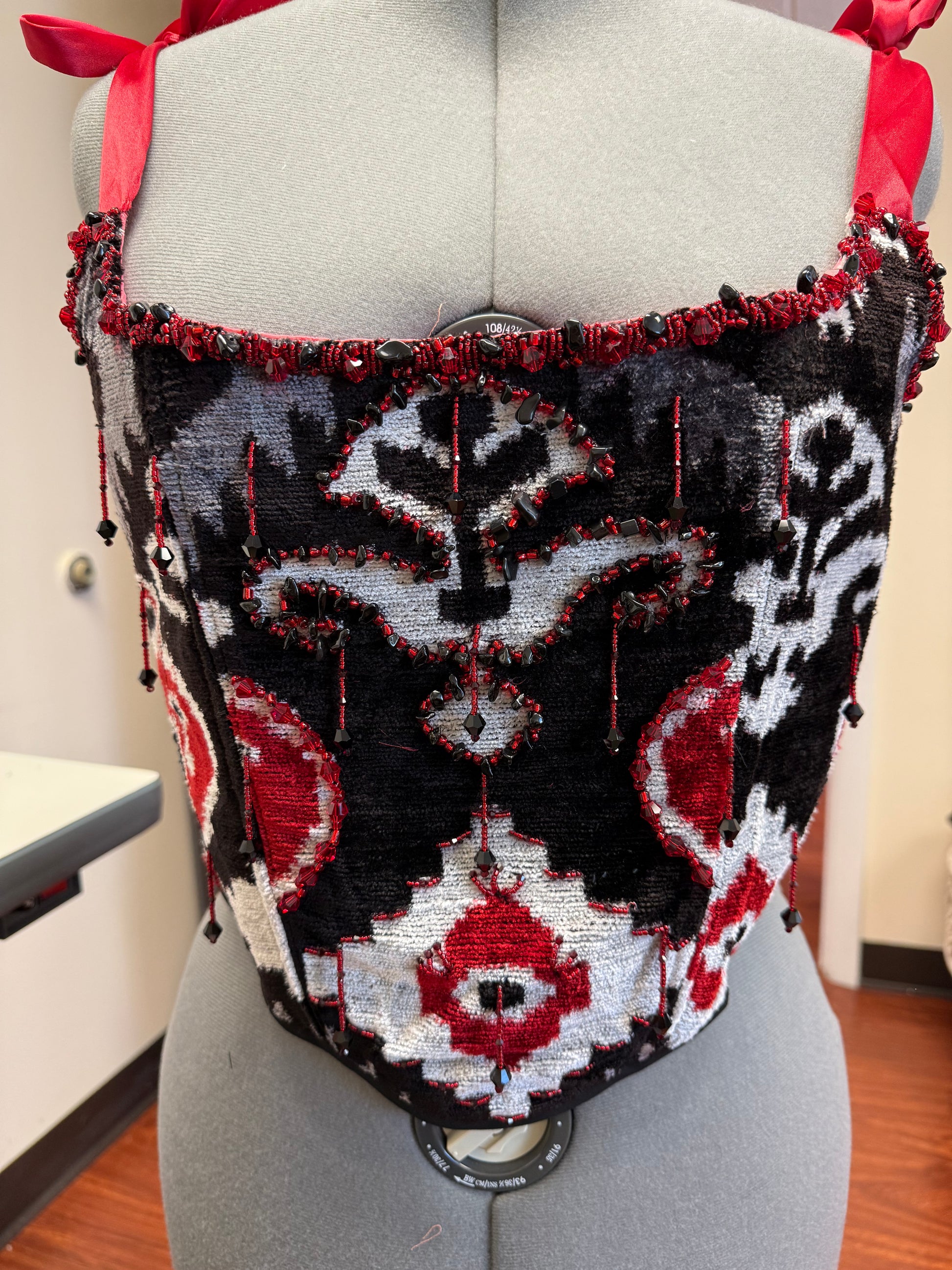 Red Angel corset top. Handwoven traditional velvet fabric. Lining is vintage silk. Used high quality glass beads. Limited edition design. Timeless, Unique and Elegant